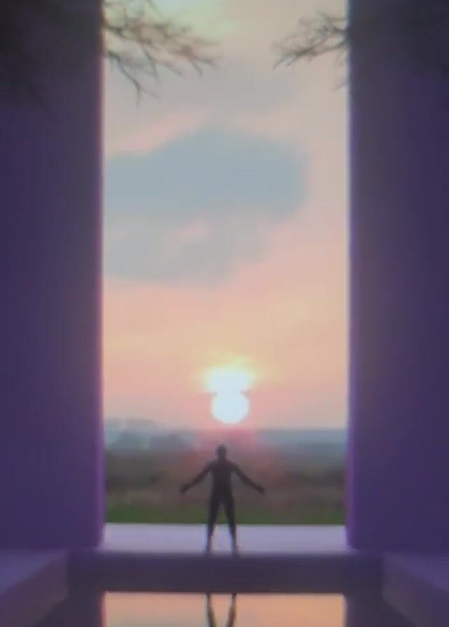 A still image displays a lavender structure with arches surrounding a reflecting pool. A silhouetted figure stands in the center, arms outstretched, facing a sunset visible through the arch. The figure's reflection is visible in the pool. Green foliage hangs over the top of the image. Lounging furniture is placed to either side of the pool. A small ad for a person named Dami, available for hire, appears at the bottom of the screen.
