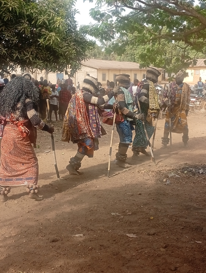 Six men wearing colorful traditional attire, including patterned robes and head coverings, are walking in a line. The men are holding long, wooden staffs. They are walking in a line across a dirt road in front of a single-story building. Several other people, including women and children, can be seen in the background. The environment appears to be rural, with trees and shrubs surrounding the building and the road. The men are dressed in a manner that is consistent with traditional Nigerian clothing. The image appears to have been taken in Gundzhe, Nigeria, based on the provided coordinates.