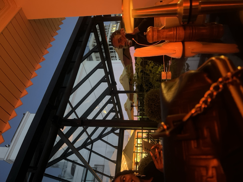 The scene is set on a rooftop terrace or balcony, likely at the Balcony Bar or a similar lounge area of the Villa Rosa Kempinski hotel in Nairobi, Kenya, during twilight or early evening
