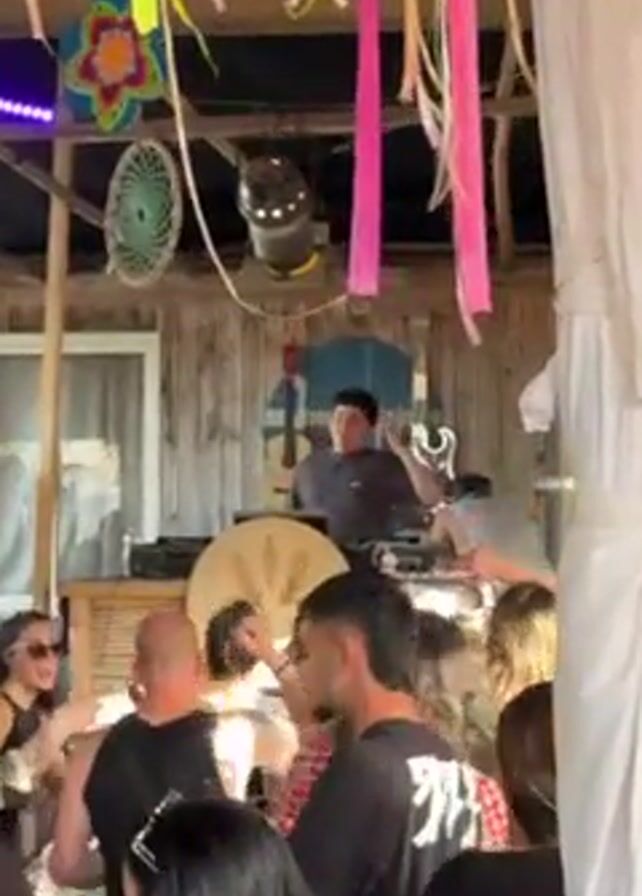 The video captures a vibrant party scene, focusing on a DJ performing for a crowd of people