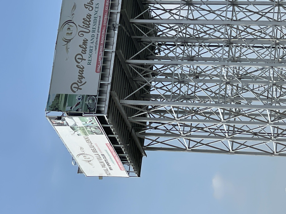 An elevated multi-panel billboard structure stands prominently against a clear blue sky in Igando Oloja, Nigeria. The structure consists of a massive grey metallic lattice framework of interconnected vertical and diagonal beams supporting the advertising panels. The primary billboard displays information for "ROYAL PALM VILLA IBEJU-LEKKI" and "RPV SPORTS CLUB," featuring images of various sports such as golf, tennis, and basketball, alongside the phrase "...satisfaction guaranteed." An adjacent billboard panel continues the "Royal Palm Villa Ibeju-Lekki RESORT AND RESIDENCES" advertisement, listing amenities like "GOLF • LAWN TENNIS • BASKETBALL • FOOTBALL • ICE SKATING," also displaying corresponding imagery. No individuals are present in the visible scene.