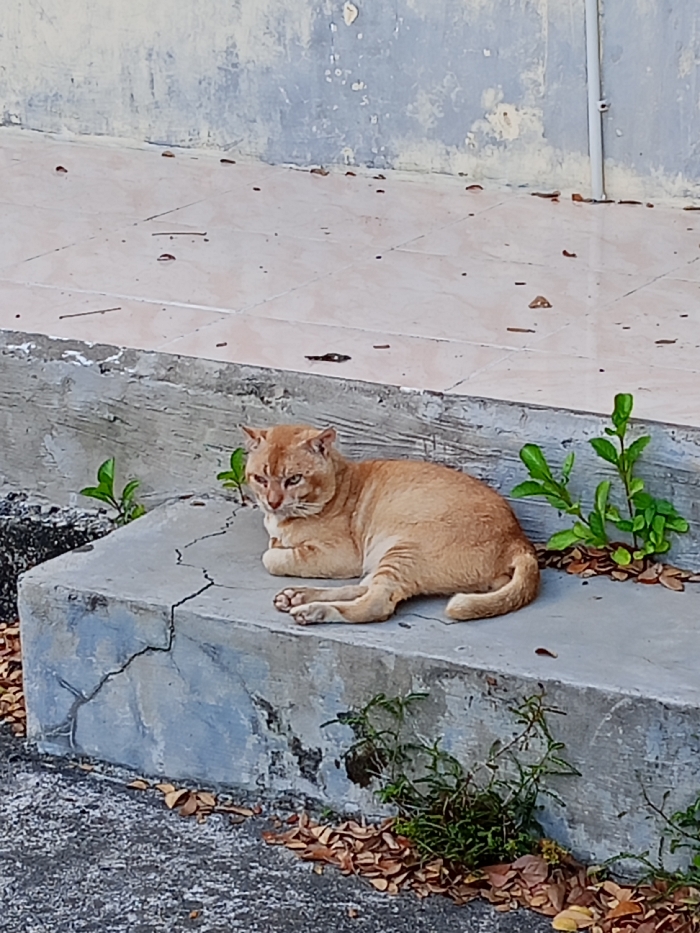A short-haired, orange tabby cat is observed resting on a weathered concrete step in the city of Unknown, Unknown