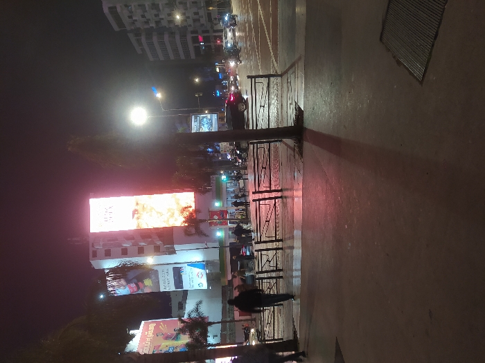 Night scene shows a city street with buildings, advertisements, and street lights. A large, illuminated billboard dominates the view. Trees flank the street, and a metal railing separates the sidewalk from the street. A few people are walking on the sidewalk. The scene is illuminated by various light sources, creating a vibrant urban ambiance.