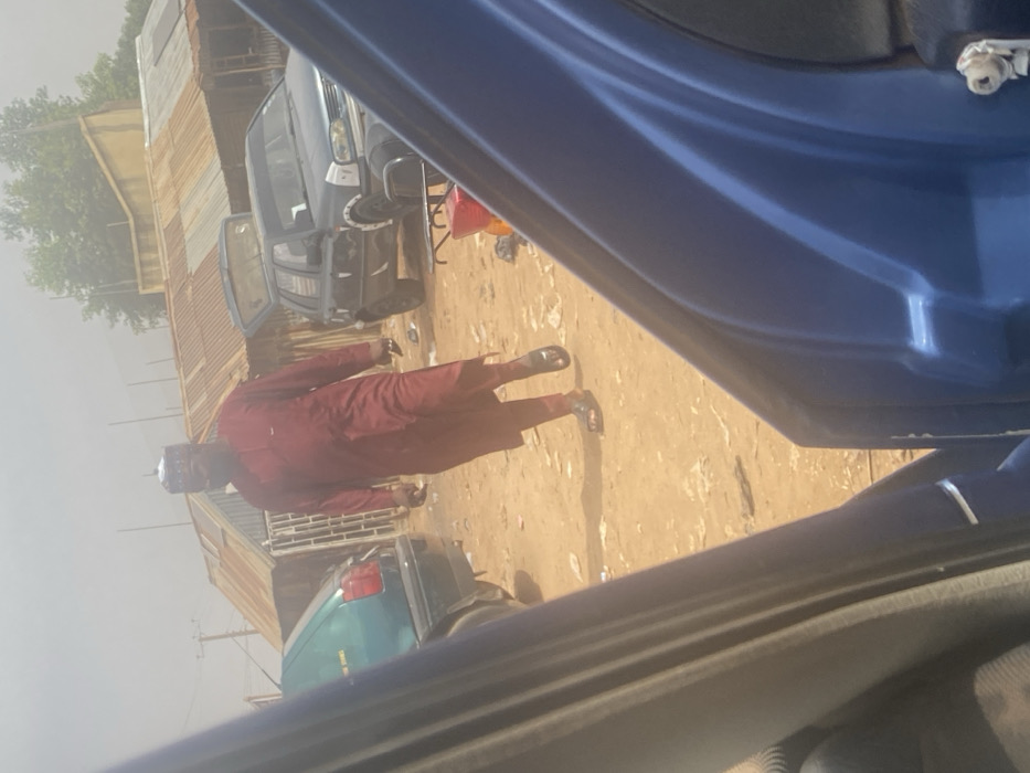 The image depicts an outdoor urban scene in Birnin Kebbi, Nigeria, viewed from within a stationary blue vehicle, with the passenger-side door partially open