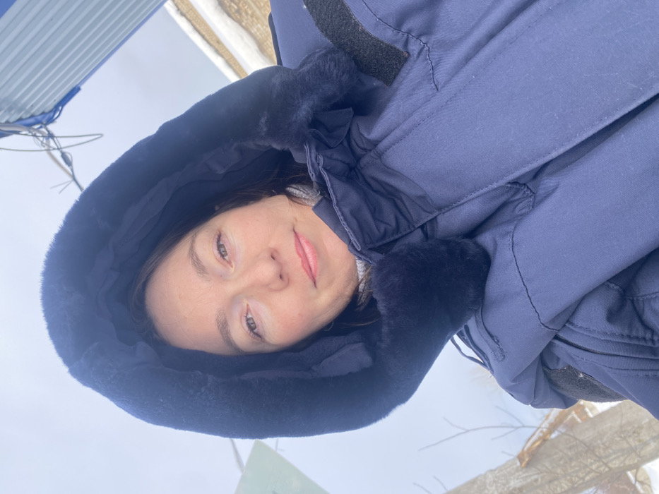 An outdoor, eye-level portrait shows a female subject, appearing middle-aged, looking directly into the camera. She has dark hair and light-colored eyes, with a neutral facial expression. She is wearing a dark navy blue winter parka, featuring a prominent fur-lined hood that is pulled up and frames her face. A light gray turtleneck is visible beneath the parka. The background is softly blurred but reveals elements consistent with a cold, overcast outdoor environment. An light gray sky dominates the upper background. To the upper right, a section of a blue corrugated metal structure with exposed wiring is visible. Faint outlines of a light-colored sign or structure and bare tree branches or utility poles are discernible to the upper left. A horizontal line of accumulated snow is present along the middle-right background. The scene is located in the city of Ol'khovskoye, Russia.