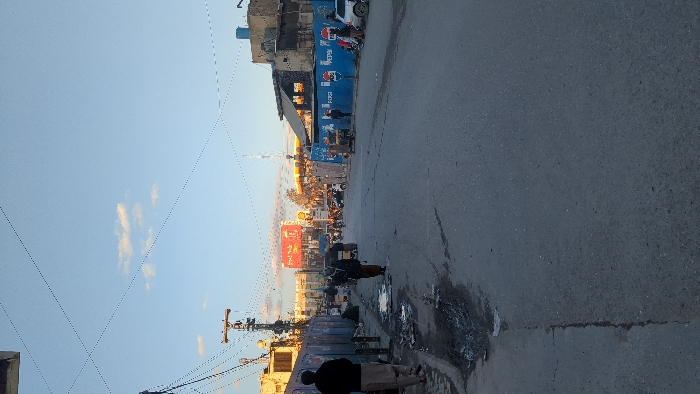 A street view under a partly cloudy sky. Buildings and shops line the left side, including a Pepsi advertisement on a blue wall. Power lines crisscross the sky. People walk on the sidewalk beside a grey asphalt road, which features some puddles. A large red advertisement is also visible in the distance.