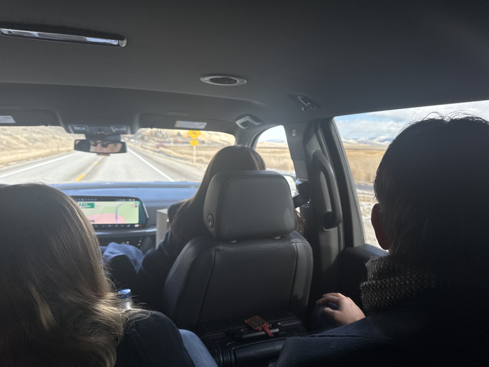 Inside a car, a view through the windshield shows a road stretching through a landscape of brown fields under a partially cloudy sky. The rearview mirror reflects the driver's face. Two people are visible in the back seats, one with long brown hair and another with short dark hair wearing a scarf. A navigation screen is visible on the dashboard. The interior of the car is gray.