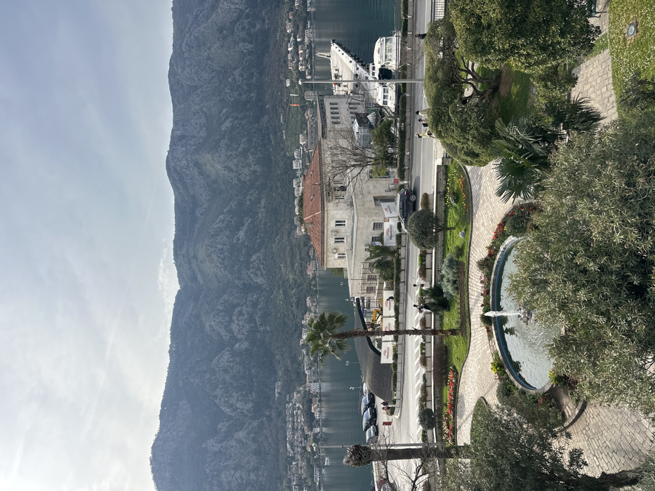 The image displays an elevated view of the waterfront in Kotor, Montenegro