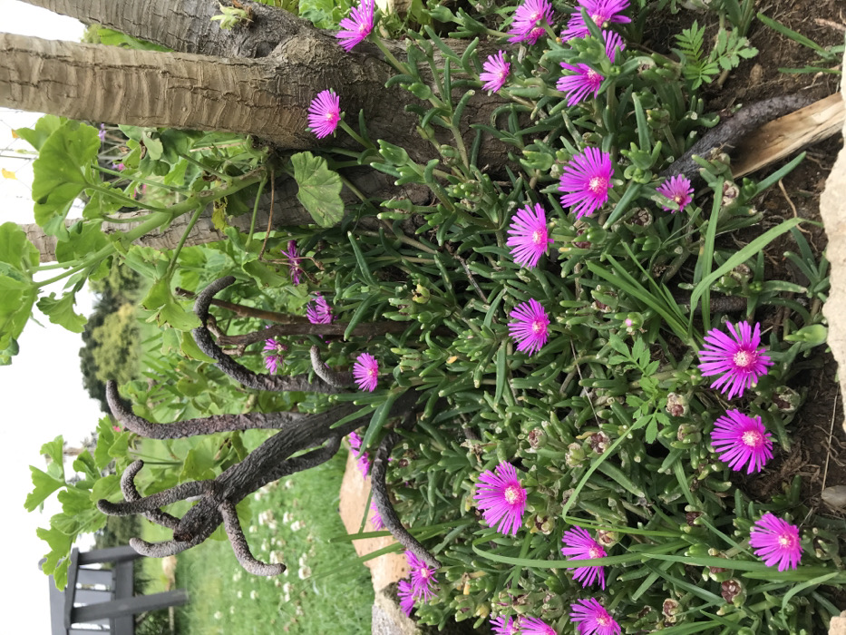 This outdoor photograph depicts a garden scene in Germiston, South Africa, primarily focusing on botanical elements. The foreground is dominated by a dense cluster of vibrant pink-purple succulent groundcover plants, each flower exhibiting numerous thin, radiating petals surrounding a lighter center. The foliage consists of thick, green, finger-like leaves. Interspersed within this groundcover are several dark, gnarled woody branches with rough textures and upward-curving sections. To the right, two light-brown tree trunks with textured bark rise vertically, partially surrounded by the flowering plants and broad green leaves, consistent with a *Pelargonium* species. The background features a green lawn dotted with small white flowers, a partial view of a dark grey slatted wooden garden bench on the left, and out-of-focus green trees and foliage, all under a diffused, overcast sky. No individuals or animals are present.