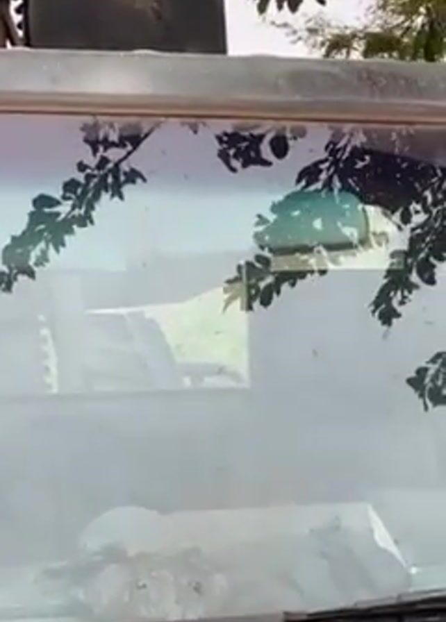 static close-up of the top part of a military vehicle, possibly a pickup truck, under tree branches. Mounted on top of the vehicle is a weapon system, likely a machine gun, with protective shields. The windshield is dirty and reflects the surrounding greenery, and the interior is dimly visible. The scene is outdoor and appears to be in a rural or semi-rural area.