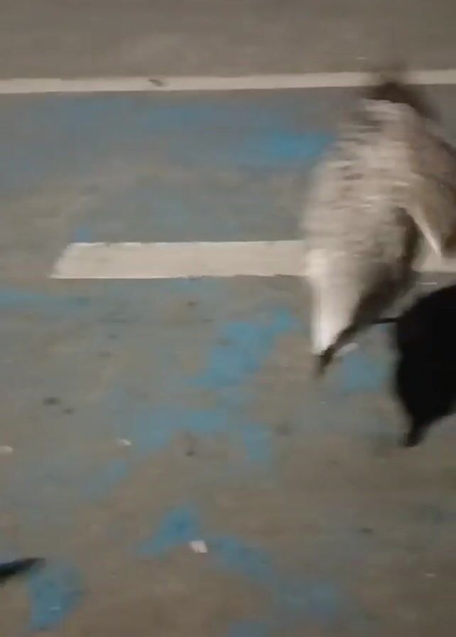 three seagulls on a parking lot. One seagull is standing in the background, while the other two seagulls are in the foreground. They are walking around and pecking at the ground, while emitting bird sounds. The parking lot has blue and white painted lines. The lighting is dim, and it appears to be nighttime.