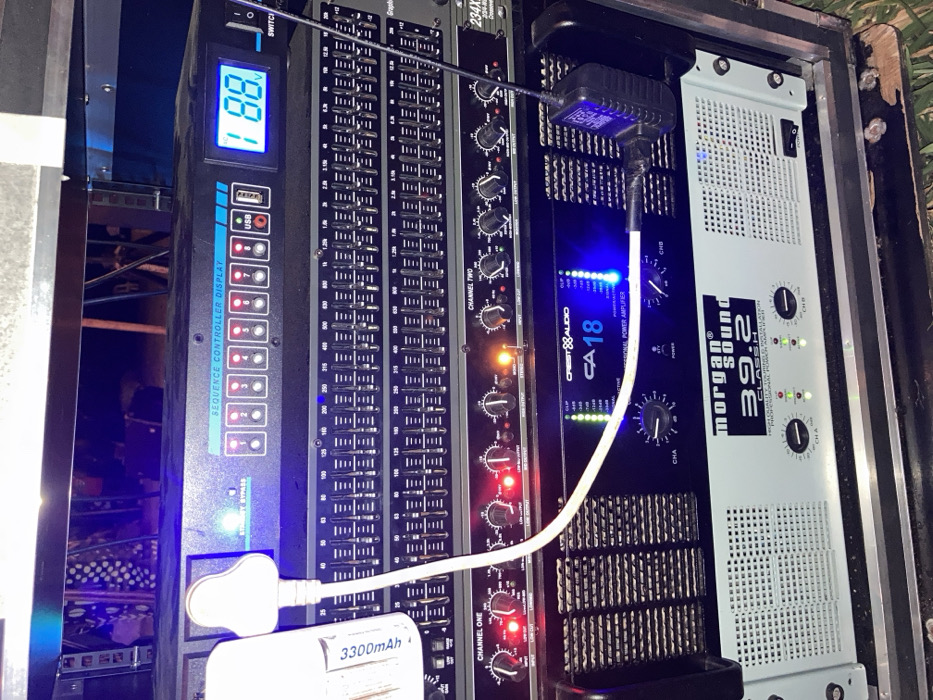 rack of audio equipment. From left to right: a sequence controller display with a digital voltage readout and USB port, a graphic equalizer, an audio crossover unit with labeled channels, a Crest Audio CA18 professional power amplifier, and a Morgan Sound 39.2 Class H amplifier. A white USB cable is connected to the sequence controller, and a power bank labeled "3300mAh" is attached to the cable. The equipment has various LEDs indicating power and signal presence.