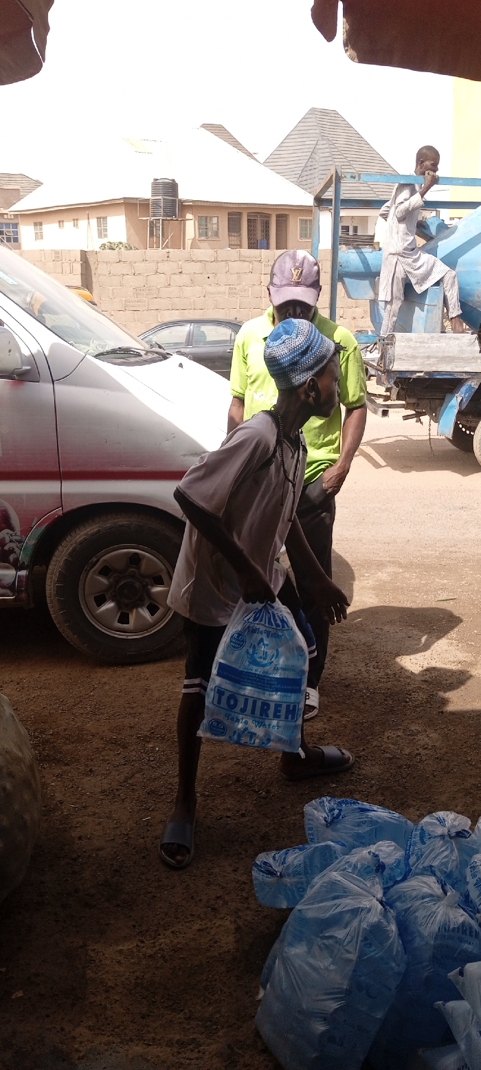 The scene depicts an outdoor commercial area within Aviation Quarters, Nigeria, under bright daylight. In the foreground, a young male, wearing a light-colored short-sleeved shirt, dark shorts with white stripes, blue slides, and a blue and white patterned kufi, holds a large clear plastic bag filled with smaller sachets of "TOJIREH Table Water" in his left hand. He wears a dark beaded necklace and is positioned to the left of the frame, appearing to be in motion. Directly behind him and partially obscured by a silver utility van, an adult male stands, wearing a bright lime green short-sleeved shirt, dark trousers, and a purple baseball cap with a gold "LV" logo. His hands are near his pockets. To the lower right, multiple similar bags of "TOJIREH Table Water" are stacked on the unpaved, reddish-brown dirt ground. In the mid-ground, a silver or light grey van with a red stripe and a grape motif on its lower side is parked. Behind it, a dark-colored sedan is visible. To the right, a light blue truck, possibly a tanker or a flatbed carrying a large blue cylindrical object, is present. A third male, wearing a light-colored striped traditional garment, is observed climbing or standing on the light blue truck's bed. The background features a low, unfinished concrete block wall. Beyond the wall, several single-story residential buildings with light-colored or grey tiled roofs are visible. One building has a black plastic water tank elevated on a stand. The sky is clear and bright. Shadows are cast on the ground, indicating direct sunlight.