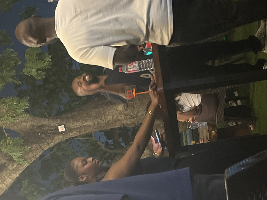A group gathers outdoors at night. A woman holds a phone and reaches toward a small basketball hoop affixed to the edge of a dark-colored table. Other people are either seated at the table or standing behind it. A water bottle is visible on the table. The background contains a large tree.