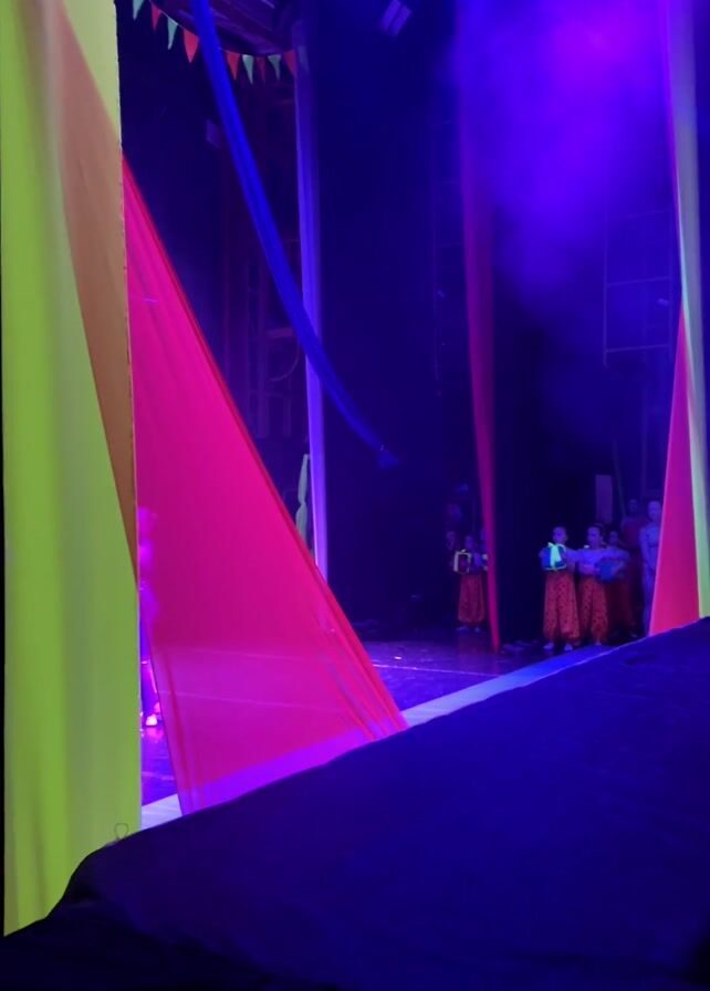 stage with performers visible behind colored fabric dividers. The fabric dividers are lime green, red, and black. There is a long blue fabric hanging from the ceiling. Behind the fabric, there are performers who appear to be children, wearing matching red and orange dresses with blue tops. The stage is lit with purple and blue lights. The video looks like it was taken from the back of the stage, looking forward. There are black curtains covering the back of the room.