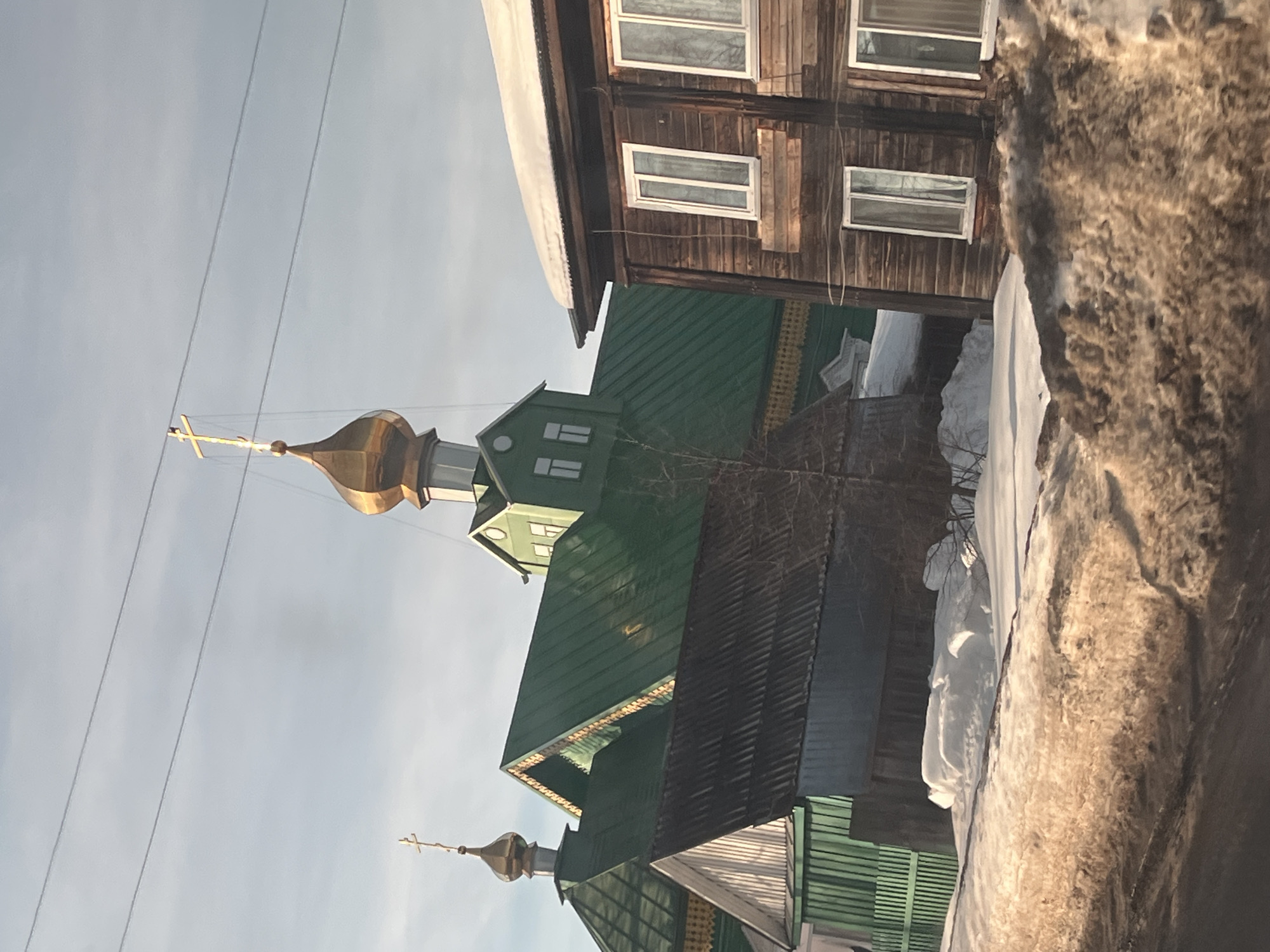 The scene depicts a winter landscape in Kambarka, Russia. In the center, a multi-component church building features prominent green metal roofs with detailed golden trim. Two golden onion domes, each topped with a golden Orthodox cross, are visible. The larger, central dome is situated above a light green structure with two square windows on its facade. To the left, a smaller golden dome and cross rise above a lower section of the church. Adjacent to the church on the right stands a two-story, weathered brown wooden house with white-framed windows, its flat roof edged with snow. The foreground shows deep accumulations of snow, much of it appearing dirty or brownish. Power lines traverse the pale, slightly cloudy sky above the structures. Bare tree branches are visible between the buildings and in the midground snow. No individuals are present.