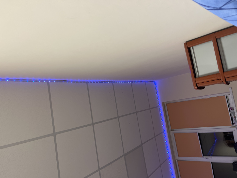 The image depicts an interior room in Pleven, Bulgaria, characterized by a white modular suspended ceiling with a grey grid system. Blue LED strip lighting is installed along the perimeter where the ceiling meets the walls, illuminating the upper sections of the left and far walls. The walls are painted a light, neutral color. On the far wall, two windows are present, each fitted with light orange roller blinds that are partially or fully lowered. Reflections of the blue LED lights are visible within the windowpanes. A brown or reddish-brown plastic storage unit, featuring lighter-colored drawer fronts, is partially visible in the lower right foreground. Indistinct objects rest on the windowsill. No individuals are clearly depicted; a segment of blue striped fabric, likely a garment, is visible in the extreme lower right, indicating the immediate proximity of the camera.