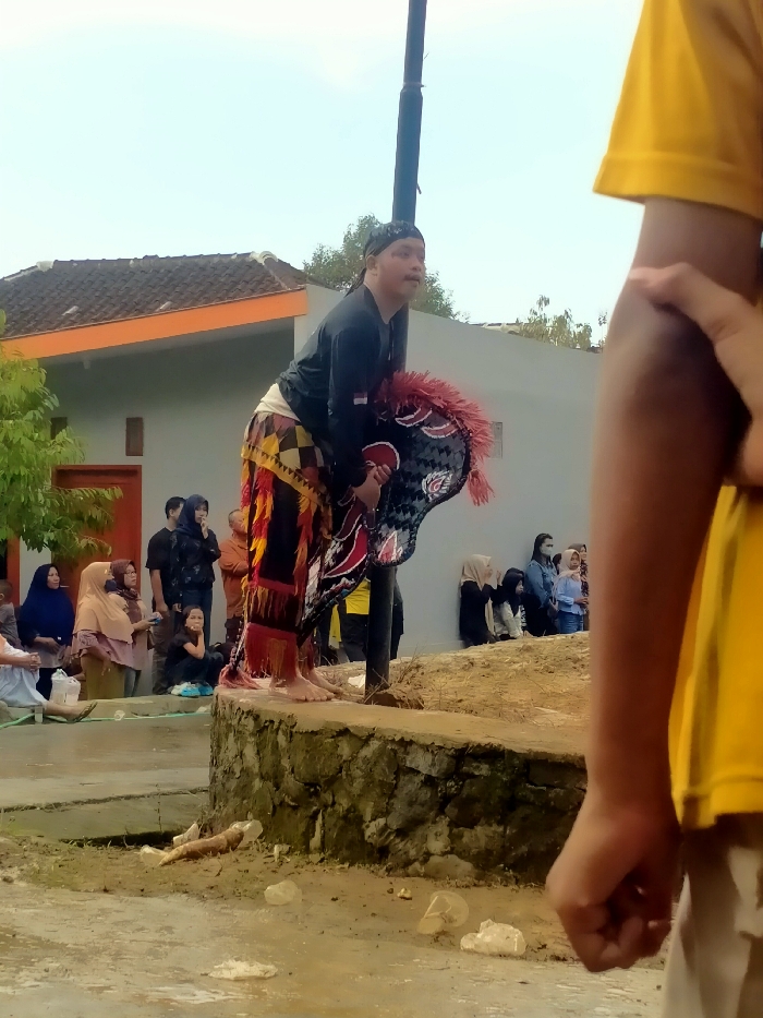 An outdoor scene in Ganten, Indonesia, depicts a cultural performance under an overcast sky. In the mid-ground, a male performer is positioned on a low, moss-covered stone and concrete wall. He wears a black long-sleeved shirt, a traditional patterned skirt-like garment with red and yellow fringes, and a dark head covering, appearing barefoot. He holds a decorated Kuda Lumping (hobby horse) prop, primarily black with red accents, and looks upwards and to his right. A dark vertical pole stands immediately behind him. In the immediate foreground, the right arm and shoulder of another individual, wearing a yellow t-shirt and light-colored pants, partially obscure the right side of the frame, facing towards the performer. Behind the performer, a diverse group of spectators is gathered near two residential-style buildings. One building on the left features a brown tiled roof with an orange trim and a brown door; another building on the right is light grey or white. The spectators, men and women, are observed standing and sitting. Several women wear hijabs, and some individuals wear face masks. Green foliage is visible to the left of the buildings. The ground in the foreground is a mix of concrete paving and dirt, with scattered pieces of white debris (possibly plastic or ice) near the wall and on the ground.
