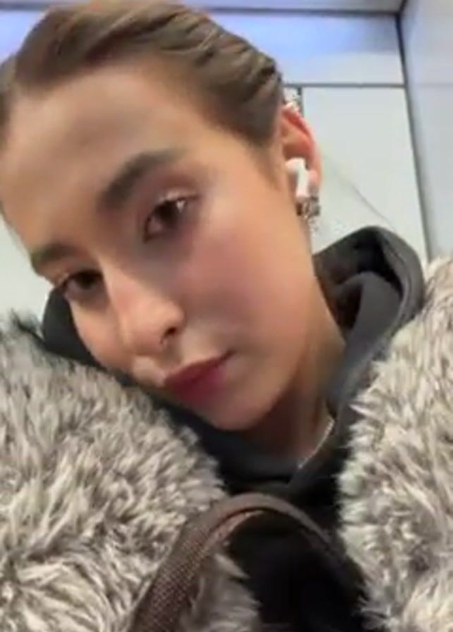 A young woman with light brown hair pulled back into braids and pink eye shadow is looking directly at the camera. She is wearing a dark hooded sweatshirt under a large, furry gray coat. She is on what appears to be a plane, evidenced by the white wall and overhead light. She looks tired at first, then leans her head to the side and gives a small smile, before returning to a neutral expression and looking straight ahead. She has a nose ring and ear buds in her ear. A purse or bag strap is visible across her chest.