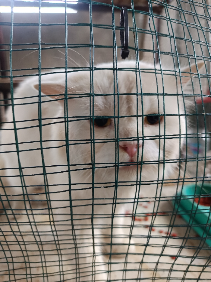 - "A fluffy, white cat is seen through a green wire cage" by FM-WRTkH2, licensed under CC BY 4.0