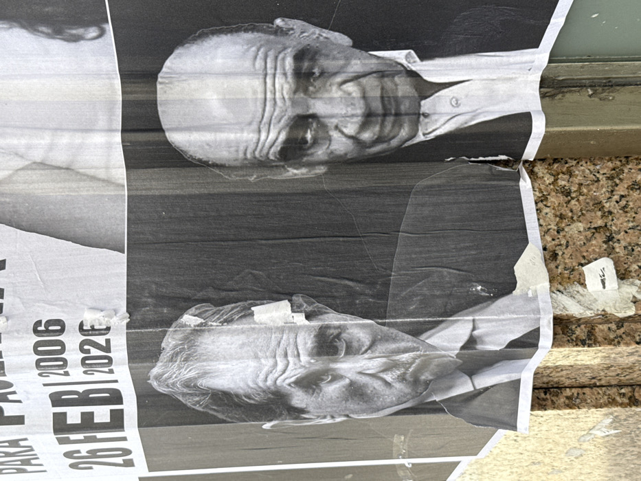 A partially torn and peeling black and white poster is adhered to a textured surface. The poster features a duplicated portrait of an older man with wrinkled skin, wearing a collared shirt. The portraits are oriented in opposite directions, one upside down relative to the other. Text on the left side of the poster includes dates: "26 FEB 2006 / 2026." The poster is damaged and distorted, with some sections missing or obscured. Tape remnants are visible, indicating previous attempts to secure the poster.