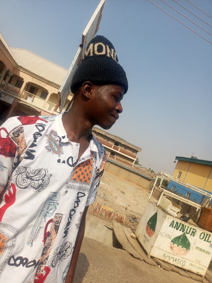 An outdoor photograph, taken in Pantame, Nigeria, features an adult male in the foreground, positioned on the left, looking towards the right and slightly downwards. He has dark skin and is wearing a black knit beanie with the word "MONO" visible in a lighter color on the front. His attire consists of a short-sleeved, collared shirt with a white base, decorated with a multi-patterned design incorporating paisley, abstract forms, and geometric elements in various colors including red, orange, black, and blue. The background shows an urban setting under a clear, light blue sky. To the immediate right of the individual, a white, cuboid-shaped fuel dispenser is visible, labeled "ANNUR OIL" with green leaf motifs. Sub-labels include "AZ TOTAL", "AMMASCO", "PETROL & KERO", and a contact number (08030999372). Wooden planks are situated on the ground near the dispenser. Behind the subject, on the left, a light-colored multi-story building with balconies is present. Further back, another multi-story building with reddish-brown walls is visible, and on the far right, a yellow and blue building is partially seen. The ground surface consists of dirt and paved sections. The scene is illuminated by bright daylight.