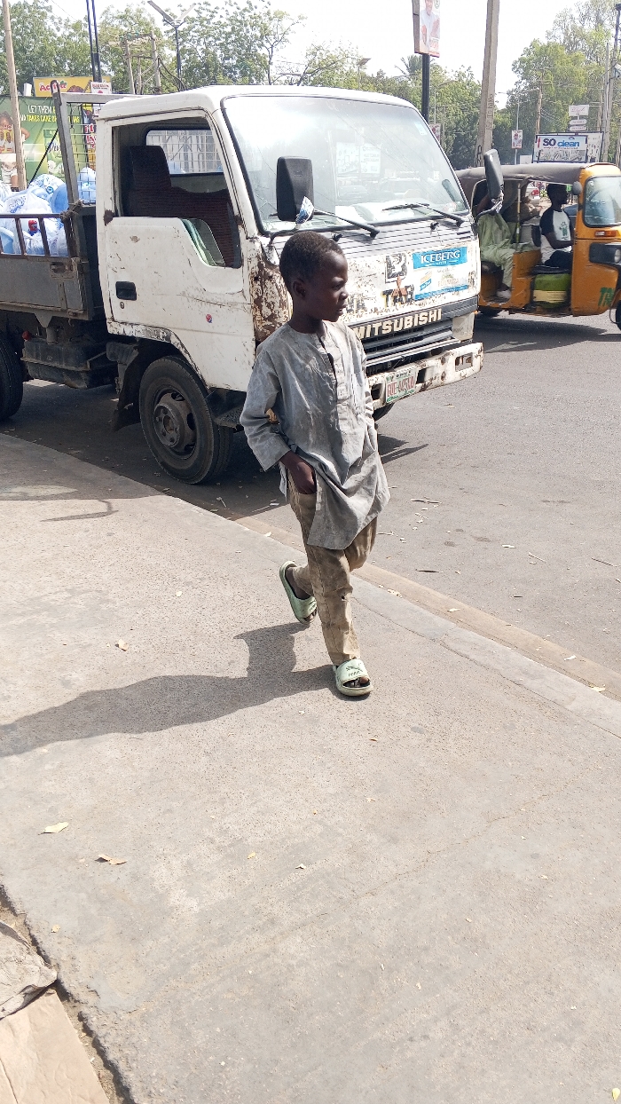 - "The scene depicts a young boy walking on a concrete sidewalk alongside a road in Kawaji, Nigeria, during daylight hours under bright sun" by FM-dHl4F2, licensed under CC BY 4.0