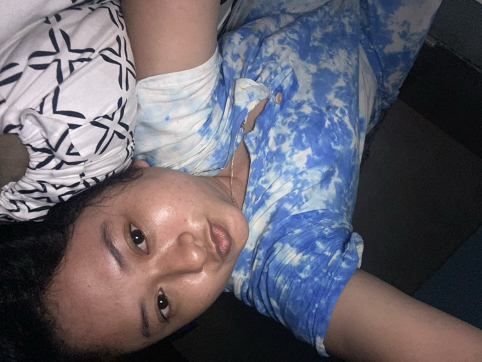 A single individual, an adult female of apparent Southeast Asian ethnicity, is depicted in a close-up, portrait-oriented image. She is lying down, resting her head on a white pillow with a dark geometric pattern resembling stylized crosses. The individual is wearing a blue and white tie-dye patterned top, which appears to be a collared shirt with a visible button closure on the front. A thin, silver-colored chain or necklace is visible around her neck. Her dark hair is visible on the right side of the frame, and her face, illuminated with a slight sheen on the skin, is directed towards the camera with a neutral expression and slightly pursed lips. The background is largely indistinct and dark, with a dark blue or teal surface partially visible on the left. The lighting is low, originating from the front. This scene is located in the city of Gelam, Indonesia.