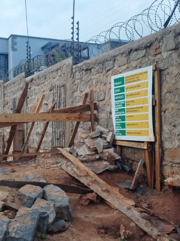 construction site in Othaya, Kenya, located at coordinates -0.44 latitude and 36.958 longitude. The scene is set against a backdrop of a stone wall topped with barbed wire fencing. A signboard is attached to the wall, detailing information about a proposed residential development project. It includes details about the project, client, architect, structural engineer, main contractor, and various approval numbers. The signboard is partially obscured by wooden support beams, suggesting ongoing construction. Scattered in front of the wall are numerous pieces of wood, rocks, and construction debris, indicating an active work zone. The ground is primarily brown, likely due to the presence of soil and exposed earth. The environment is characterized by an overcast sky, and a general sense of disarray, typical of a construction site.