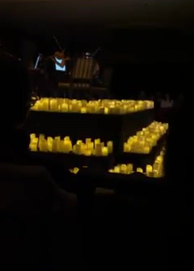 Here's a detailed description of the video: The video captures a performance in a dimly lit, elegant room, likely a ballroom or concert hall. In the foreground, a three-tiered structure is adorned with numerous lit LED candles, creating a warm, intimate atmosphere. The candles glow with a soft, yellow light, illuminating the surrounding area. Behind the candles, a small orchestra or musical ensemble is visible on a stage. Musicians can be seen with their instruments, suggesting they are performing live. A person is seen standing beside the musicians with a bow, possibly conducting the ensemble. The lighting on the stage is slightly brighter than in the audience area, allowing for a better view of the performers. The audience is partially visible in the background, seated and watching the performance. The overall impression is that of a sophisticated and enchanting musical event.