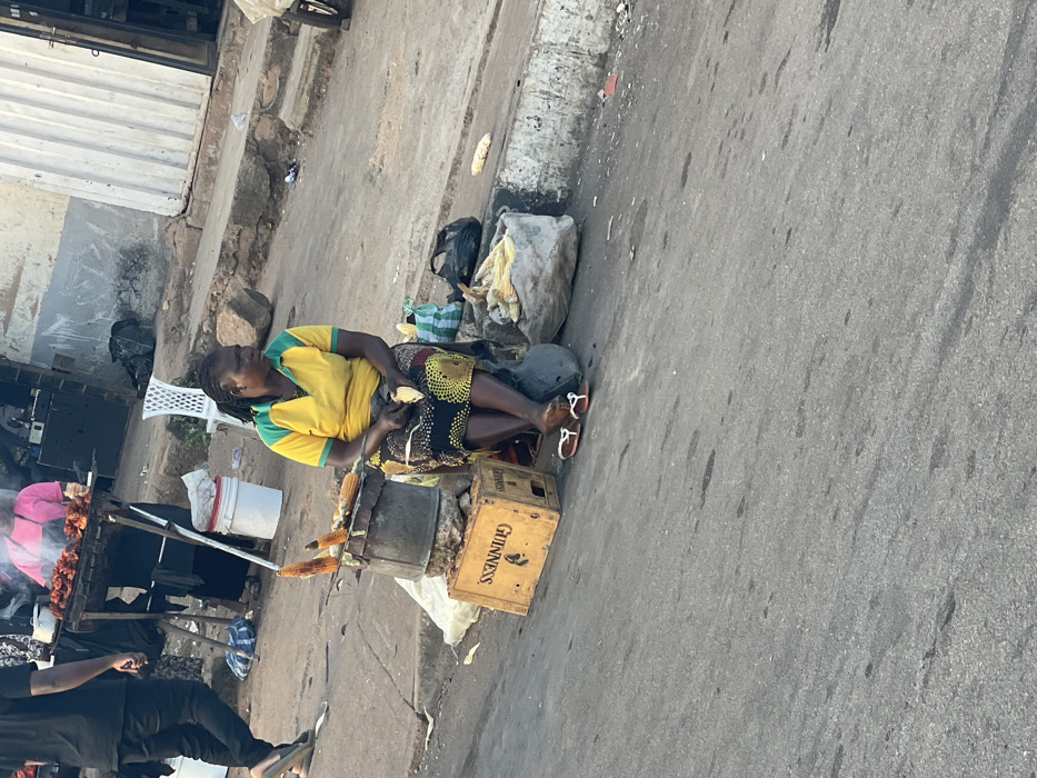 The image portrays an outdoor market scene in Barakin Lerawi, Nigeria. A dark-skinned woman, wearing a yellow and green polo shirt with a patterned skirt and white and brown sandals, is seated on a dark object by an asphalt road. She holds a peeled ear of corn in her left hand and a partially peeled ear in her right. Adjacent to her left, a wooden 'GUINNESS' crate supports a metal container from which multiple roasted corn cobs are displayed on a skewer. To her right, a grey bag contains unpeeled corn, alongside a black plastic bag. In the background, a person in a pink top operates a metal grill laden with roasting meat, generating visible smoke. A white plastic bucket is positioned near the grill. Further left in the background, an individual in dark attire walks away from the viewer. The environment features a concrete curb, a raised dirt and concrete area with scattered debris, and a corrugated metal building structure. A white plastic chair and a partial vehicle wheel are also present.