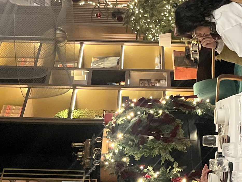The scene depicts an interior view of a restaurant or lounge area within the Voco Strasbourg Centre The Garden hotel, located in Strasbourg, France, specifically in its main dining/lounge space. In the foreground, a white-linened table is set with several clear glass tumblers and a white coffee cup on a saucer. To the left, a large, dense Christmas garland, heavily adorned with bright white lights and dark red ribbons, occupies much of the mid-left portion of the image. Behind the garland, on a dark surface, a polished brass model train engine with intricate detailing is visible. To the right, a young woman with dark, wavy hair and glasses, wearing a white turtleneck sweater, is seated in profile. Her left elbow rests on the table or an armrest, and her chin is supported by her left hand. She sits in a light green upholstered chair with a curved wooden frame. Behind her, a small table lamp with a white fabric shade provides ambient light. The background is dominated by a distinctive, multi-tiered shelving unit with illuminated yellow-gold back panels. These shelves display various items, including stacks of books (some with red spines), smaller decorative objects, and white cups or bowls. Several sections of the shelving unit incorporate curved, perforated metal mesh designs. Further to the right, a Christmas tree, decorated with numerous small white lights and a few red spherical ornaments, is partially visible. Vertical wooden slat panels are present in the far right background, contributing to the establishment's modern aesthetic. The overall lighting is warm and artificial, suggesting an evening setting.