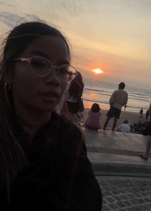 A young woman in glasses films a selfie video at a beach sunset. The sun is setting on the ocean horizon. Behind her are other people enjoying the sunset, some standing, some sitting. There's a brick or stone walkway where she's standing. The sky is cloudy, and the overall light is soft. The wind is blowing her hair.