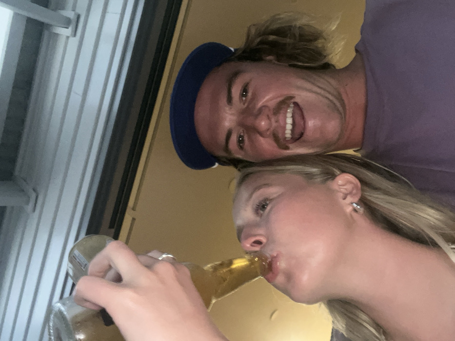 The image captures two individuals, a female and a male, in a social setting in Bulli, Australia. On the left, a fair-skinned female with blonde hair is actively drinking from a clear glass bottle containing a light-colored liquid, her head tilted back and mouth open around the bottle's neck. Her right hand holds the bottle, displaying a silver ring on her ring finger, and she wears a silver hoop earring in her left ear. To her right and slightly behind her, a fair-skinned male with brown hair and a mustache is visible. He wears a blue baseball cap reversed and a purple t-shirt. His mouth is open in a wide smile, revealing teeth, and he looks directly towards the camera. The background consists of grey horizontal slats in the upper left, above a plain, warm-toned surface.