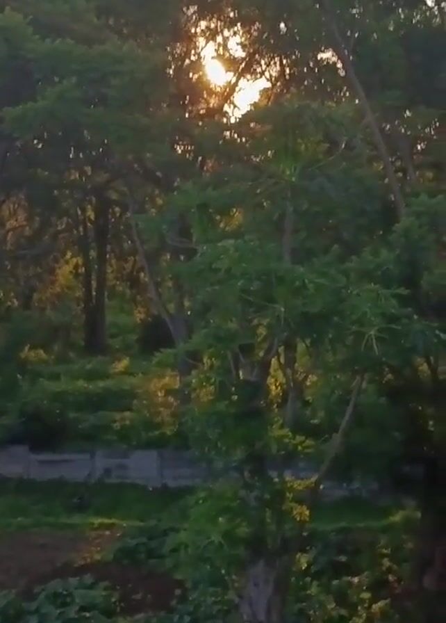 scene of a lush green landscape with trees and vegetation. The sun shines brightly through the trees, creating a dappled light effect. The trees sway slightly in the breeze. The video has a somewhat low resolution.