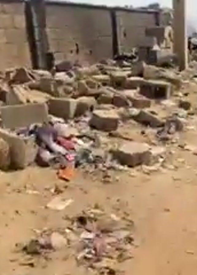 dirt road leading towards a large pile of garbage. A brick wall borders the road on the left side. The garbage pile is smoking, and there are bricks scattered around it. The sky is visible and appears clear. A person wearing a blue garment is briefly visible in the foreground. The overall scene is one of environmental pollution and waste disposal issues.