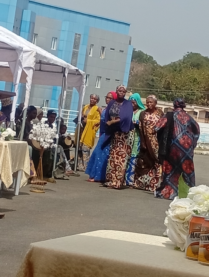 The image depicts an outdoor gathering in Okengwe - Obehira, Nigeria, under a clear, sunny sky. A group of approximately seven adult women stand in the mid-ground on a paved surface, dressed in vibrant, patterned traditional attire consisting of long gowns and headwraps. Their gazes are directed towards the left. To the left of the frame, a white canopy tent partially covers two tables draped with light-colored tablecloths and adorned with white floral arrangements. A dark drum is visible on the ground under the tent, near which a person and a child are partially obscured. In the immediate right foreground, another table with a similar tablecloth and white floral decorations holds two cans labeled "Maltina." The background is dominated by a modern, multi-story building featuring a blue and grey paneled facade. To its right, green vegetation covers a distant hill. Another building with a lighter facade is partially visible to the right of the primary building, further integrating the scene into an urban or semi-urban environment.