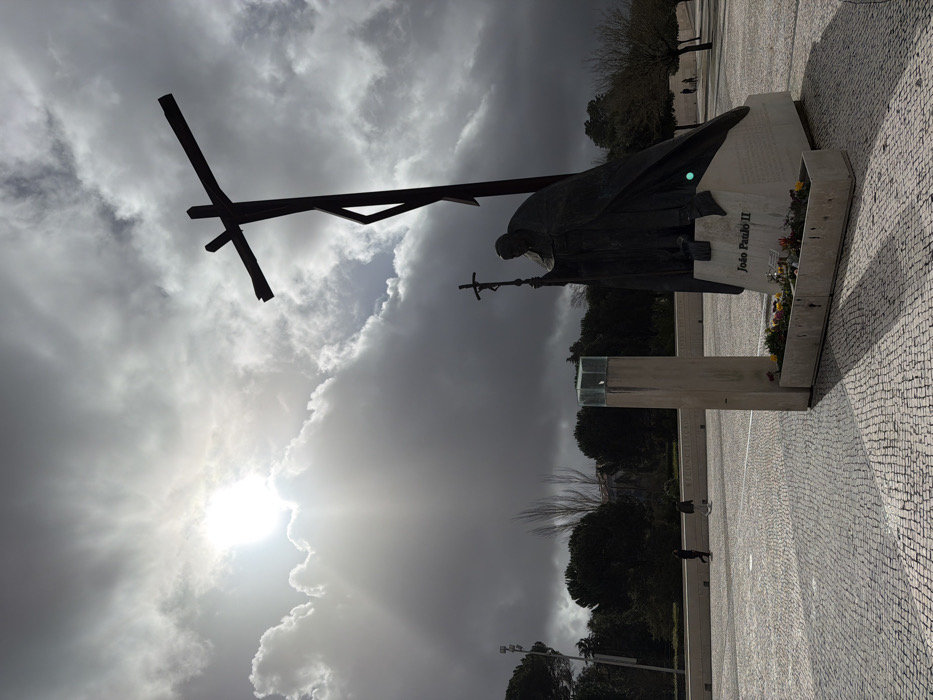 The image displays the Monument to Pope John Paul II and an accompanying large cross within the Sanctuary of Fátima, Portugal