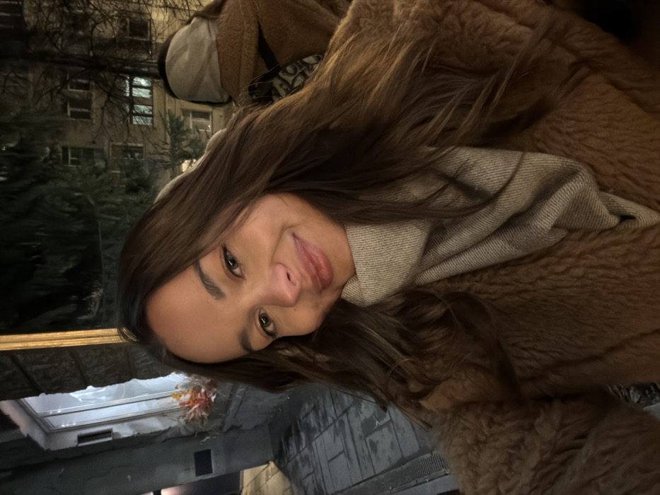 An image captures a nighttime urban scene in Krasnoyarsk, Russia. In the foreground, a female individual with long, wavy dark brown hair is depicted in a selfie-style shot, smiling directly at the camera. She wears a tan, fuzzy coat and a light grey ribbed turtleneck scarf. Her face is well-lit, highlighting brown eyes and light-colored lips. To her immediate right and slightly behind, a second individual is partially visible from the rear, wearing a light-colored hooded sweatshirt beneath a similar tan coat. A dark strap, consistent with a bag, is visible across their back. The background reveals a city streetscape. To the left of the primary subject, a paved sidewalk leads to a building featuring a large, brightly illuminated window containing orange and red foliage-like decorations. The building facade appears to be dark-toned, possibly stone or stucco, with a vertical golden architectural element alongside the window. In the distant background, bare tree branches are silhouetted against the dark sky, and a multi-story residential building with several illuminated windows is discernible. Artificial lighting sources illuminate the scene, consistent with nighttime conditions.