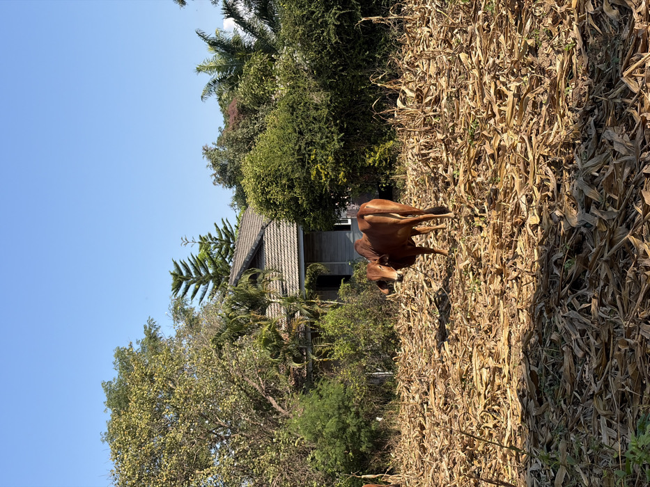A brown cow grazes in a field of dry, brown corn stalks. Behind it, a small, weathered building is partially obscured by lush green trees and vegetation. The sky is a clear, bright blue, providing a backdrop to the scene. Palm trees are visible amongst the other foliage.