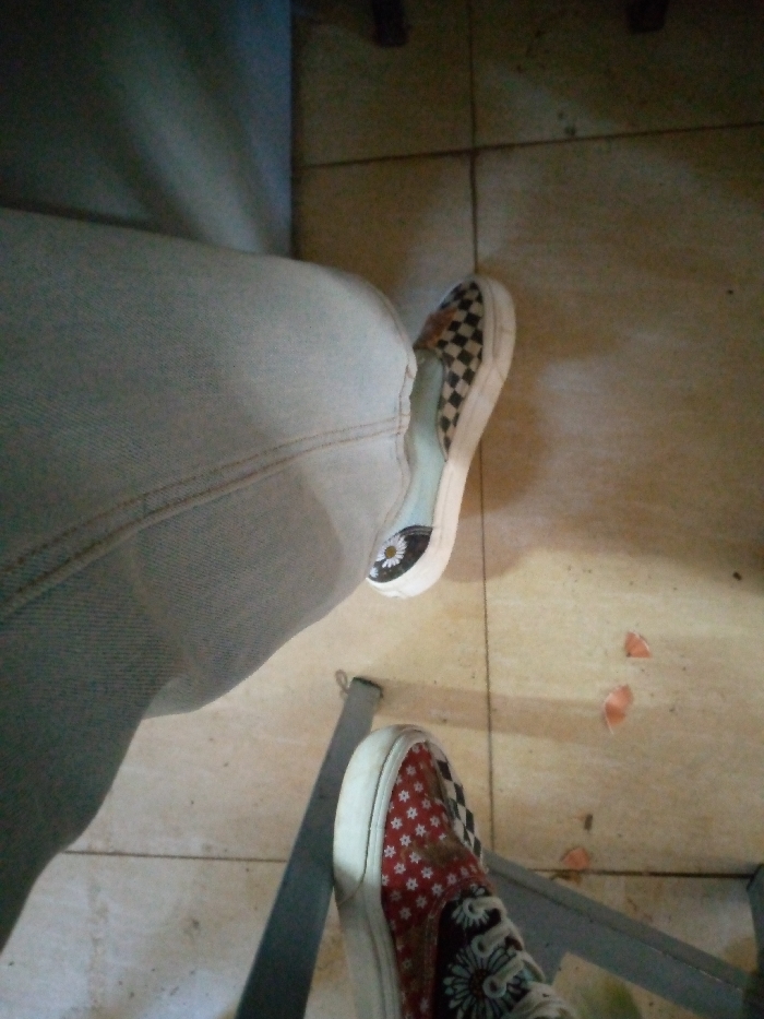 The scene, located in the city of Thika, Kenya, depicts an overhead view of the lower extremities of at least two individuals, positioned on a light brown tiled floor. The floor consists of square tiles with darker grout lines. In the upper-left quadrant, a leg clad in light blue jeans is visible. The foot associated with this leg wears a slip-on shoe featuring a black and white checkerboard pattern on the upper, a light blue central section, and a black toe cap adorned with a white daisy flower with a yellow center. In the lower-right foreground, a second, partially visible shoe exhibits a red base with numerous small white patterns, and a darker section with a larger white daisy motif. A gray metallic furniture leg extends diagonally from the bottom center, positioned between the two shoes. Several small, curved, light orange fragments, consistent with broken eggshells, are scattered on the tiled surface in the mid-right.