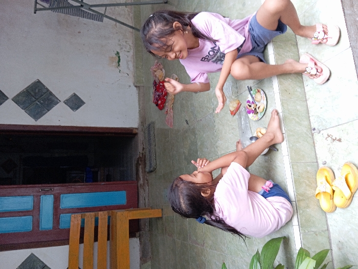 Two young girls are playing on a tiled floor outside a building. One girl, wearing a pink shirt and blue shorts, is sitting with her legs bent. The other girl, also in a pink shirt and blue shorts, is sitting with her legs extended. A plate of food sits between them. Yellow sandals are scattered nearby. The background includes a wooden cabinet with blue accents, a green wall, and some greenery.