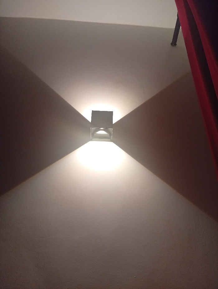 - "A square light fixture is centered on a textured, off-white wall, emitting a bright glow that casts a symmetrical, diamond-shaped pattern of light and shadow" by FM-lAXhb2, licensed under CC BY 4.0