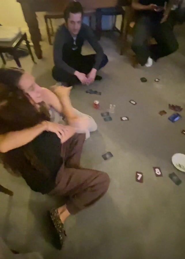 The video captures a group of friends enjoying an indoor gathering in a comfortable living room setting. The scene reveals a mix of activities, including a game of cards spread out on the floor, casual lounging on a beige couch, and general socialization. The floor has numbered cards scattered around, indicating an ongoing game. There are eight people visible in the video. One person is embracing another on the floor, two others sit on the floor nearby, and two people sit on a couch, enjoying drinks. The other people are partially visible on the couch. The room is well-lit and furnished with a wooden dining table, a coffee table covered with drinks and snacks, and assorted seating options. The couch sits in front of windows covered with beige curtains. The overall atmosphere is relaxed and informal.