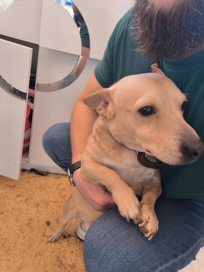 A light-tan dog with a brown collar is being held. The dog's front paws are intertwined, resting on the person's jeans. A man wearing a green shirt and jeans is holding the dog. The man's beard is visible. A white and silver decorative element is in the background on the left, with a reflection visible in the upper section. The floor is a solid tan color. A white shoe is partially visible.
