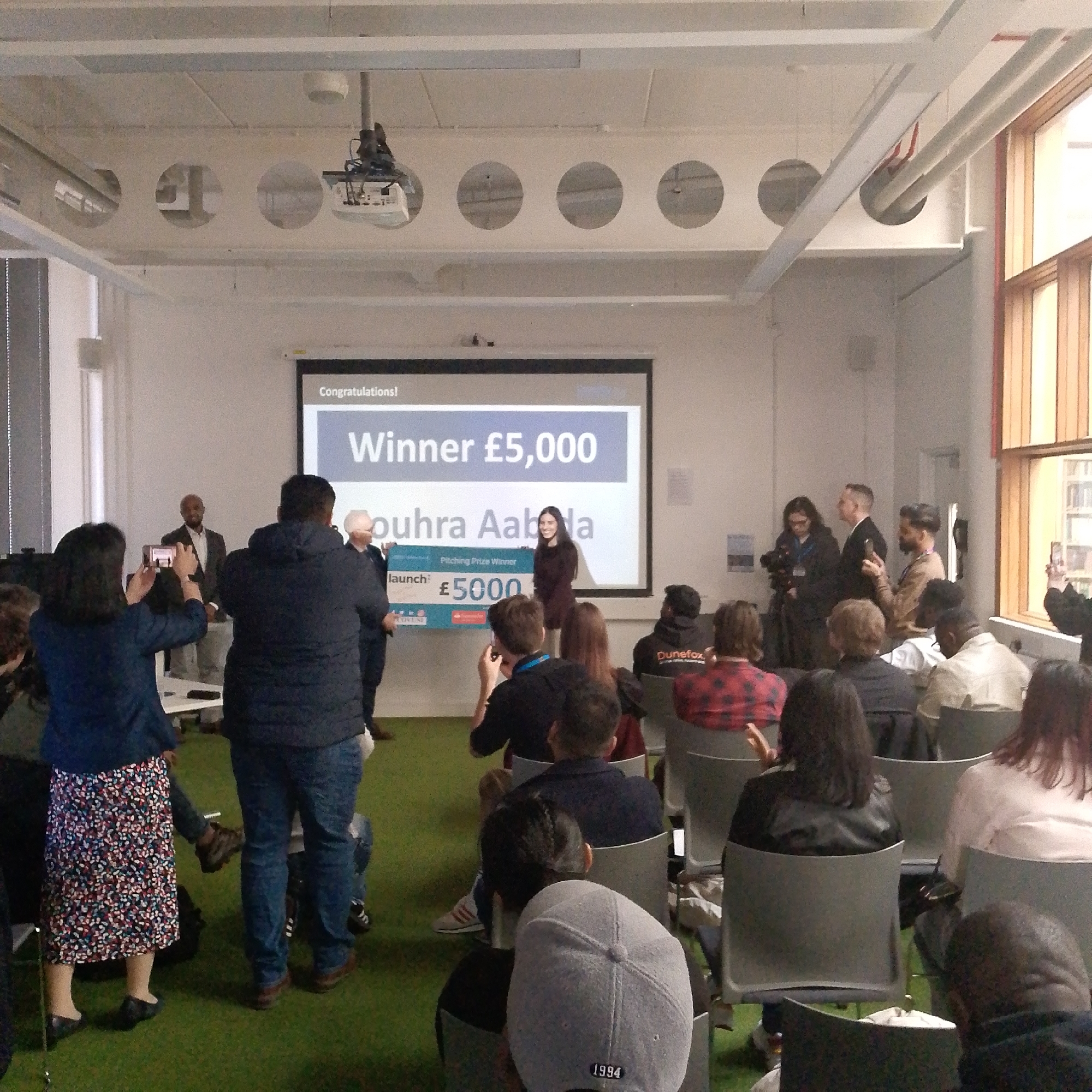 The image captures an indoor award ceremony or pitching event within a modern, brightly lit space in Coventry, United Kingdom. Approximately 20 to 30 individuals are present, primarily adults. At the front of the room, a large projection screen displays "Congratulations!", "Winner £5,000", and the name "Souhra Aabda". A young woman with dark hair, identified as Souhra Aabda, stands centrally next to an older man in a dark suit. Both are holding a large novelty check that states "Pitching Prize Winner", "Launch: Coventry", and "£5000". This event is associated with the "Launch: Coventry" initiative. Multiple individuals are positioned near the front, including a woman in a dark blue top and floral skirt and a man in a dark jacket and blue jeans, both seen holding smartphones horizontally to record the presentation. Other attendees are seated in rows of modern, light grey chairs, observing the stage. The floor is covered with green artificial turf. The room features white walls and a ceiling with exposed white structural beams containing circular cutouts, overhead lighting, and a ceiling-mounted projector. Large windows on the right side of the room provide natural light and reveal part of an exterior or adjacent building structure. Several individuals are standing near these windows, with some also holding smartphones to film.