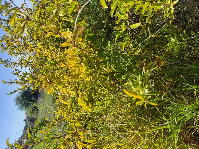 The scene depicts an outdoor, natural environment located in Lo Ferro, Spain, under clear, bright daylight. The foreground and midground are dominated by dense, mixed vegetation, primarily consisting of shrubs or small trees with abundant yellowish-green foliage. Individual branches and leaves are visible, with some exhibiting a slightly desaturated or dried appearance. Patches of green and dried grasses are interspersed among the larger plants. In the background, a distant, darker green tree is visible atop a low, indistinct rise or hill, beneath a clear, vibrant blue sky. No human figures, animals, or man-made structures are present within the frame. The lighting indicates direct sunlight.