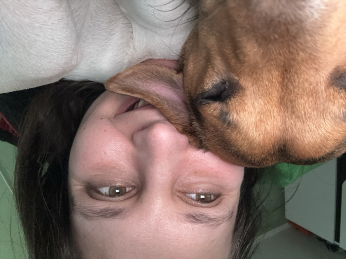 The image displays an indoor scene in Popovo, Bulgaria, featuring an adult female and a domestic canine. The right side of the female's face is visible, characterized by fair skin, dark brown hair, and a hazel right eye reflecting a light source. Her mouth is open in a smile, revealing teeth, and her gaze is directed upwards and to the right. A green garment is partially visible on her left side, and a dark, possibly red, fabric is behind her head. The canine subject, appearing to be a small to medium-sized dog, has reddish-brown fur on its head and ears, with some darker markings, and white fur on its body. Its eyes are closed, and its head rests against the female's lower face and neck area. The background includes a light green wall in the upper left, partially obscuring a white furniture item, possibly a wardrobe or cabinet.