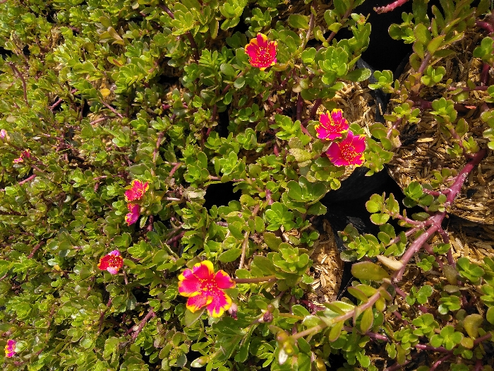 The image displays a close-up, high-angle view of multiple flowering plants in Dulce Nombre de Jesús, Costa Rica. The scene features a dense aggregation of plants with small, green, succulent-like leaves and reddish-purple stems. Numerous bi-colored flowers, primarily magenta or hot pink with distinct yellow margins and yellow centers, are visible across the foliage. These flowers are characteristic of Portulaca species. Partially obscured black plastic nursery pots are present beneath the dense plant growth, containing a light-brown, fibrous substrate resembling wood chips or rice hulls. The environment is well-lit by natural sunlight, indicating an outdoor setting. No individuals or animals are present.