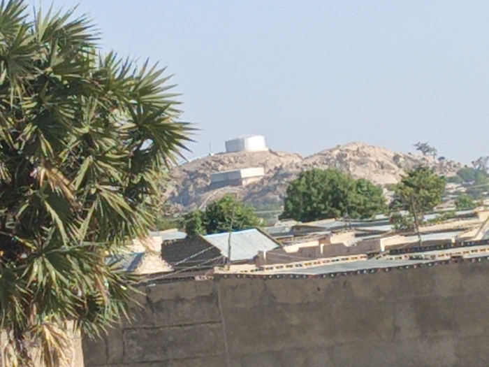 The scene, located in Dutsinma B, Nigeria, presents an elevated daytime view over an urban area towards a rocky hill under a clear, light-blue sky